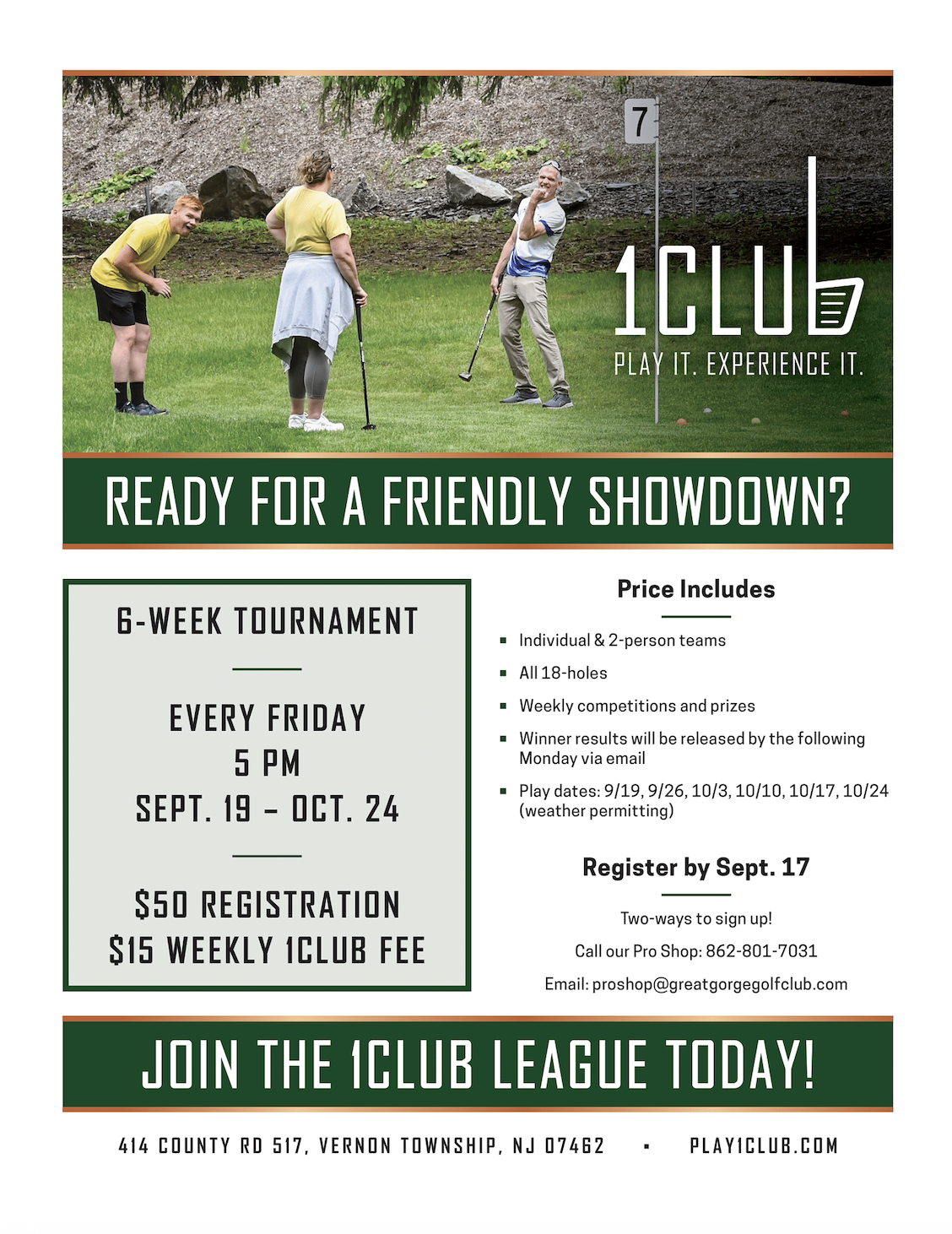 Registration is just $50 plus a $15 weekly fee. Sign up by September 17. Call the Pro Shop at 862-801-7031 or email proshop@greatgorgegolfclub.com